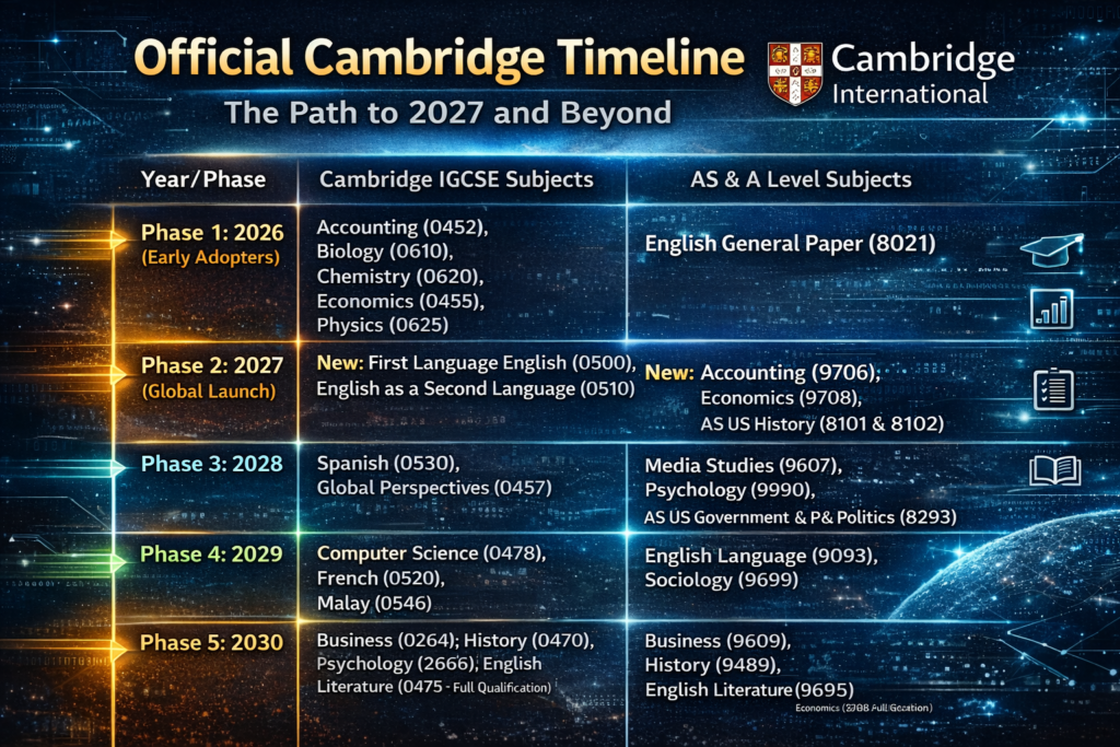 Phase 1: 2026 (Early Adopters)Accounting (0452), Biology (0610), Chemistry (0620), Economics (0455), Physics (0625)English General Paper (8021)