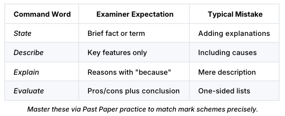 CAIE questions employ specific command words such as “state,” “describe,” “explain,” and “evaluate,” each indicating the required response format.