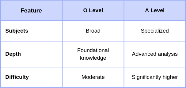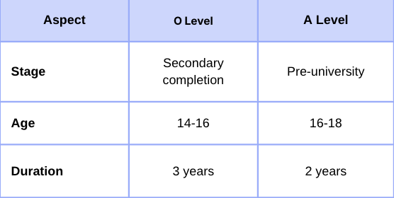 O Levels complete secondary education at average ages of 14-16, building broad foundational skills across multiple subjects. A Levels follow at ages 16-18, focusing on deep specialization to prepare students for university-level study.